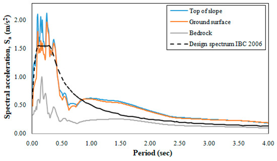Figure 10 presents the acceleration–time history of the bedrock, ground surface, and slope crest subjected to the 2023 Kahramanmaraş-Pazarcık earthquake. The natural vibration period range and damping ratio are selected while preparing the response spectra. In the present study, a wide period range is used (0.01 s–4 s) and applied for 5% damping values to include all structures in the study area. Figure 11 demonstrates the spectral acceleration–period curve of the bedrock, ground surface, and slope crest, together with the standard design response spectrum characterising the sparse earthquake ground motion with a 10% probability of exceeding the spectral magnitudes in 50 years, in accordance with IBC 2006 [10]. By comparing the response spectra, it is obvious that the spectral accelerations are affected by both local site effects and the shallow slope, causing significant amplifications. Figure 11 demonstrates that the spectral accelerations obtained from the ground surface and the slope crest during the 2023 Kahramanmaraş-Pazarcık earthquake were greater than the design spectrum in almost all periods. This is in good agreement with the findings of previous studies [6,7,35], where topographic irregularity during seismic excitation led to some increase in period and spectral acceleration values.