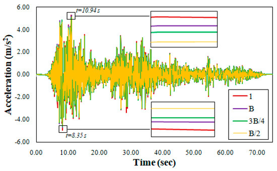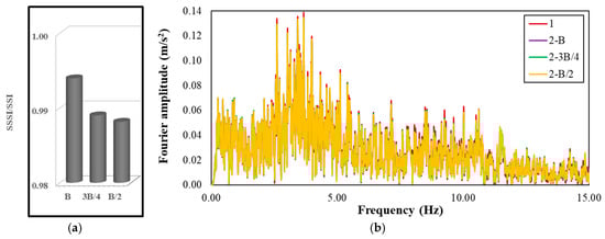 In this study, frequency response comparison was not neglected to investigate SSSI effects. For this purpose, the frequency response of the building nearest to the slope subjected to the earthquake was analysed under changing conditions. Within the scope of frequency response comparison, the spectral accelerations captured at the natural vibration frequency of the building and the frequency-dependent variation of the Fourier acceleration amplitude were investigated. Figure 12 shows the acceleration–time history of the building foundation nearest to the slope subjected to the 2023 Kahramanmaraş-Pazarcık earthquake in varying numbers of buildings and inter-building distances. In the time steps where the highest acceleration values were obtained during the earthquake duration, the highest and lowest acceleration values were captured at 1 and 2-B/2, respectively. The ratio with SSI of the spectral acceleration obtained at the natural vibration frequency of the building nearest to the slope and the frequency-dependent variation of the Fourier acceleration amplitude are presented in Figure 13a and Figure 13b, respectively. Higher spectral acceleration at building frequency and larger amplitudes at almost all frequencies are obtained at SSI. The amplitude of the earthquake waves decreased with an increasing number of buildings and decreasing inter-building distance. Despite the slope effect, SSSI resulted in decreased spectral acceleration and amplitude compared to SSI. This finding obtained from frequency analysis in the present study is in agreement with the findings of previous studies on SSSI [38,39].