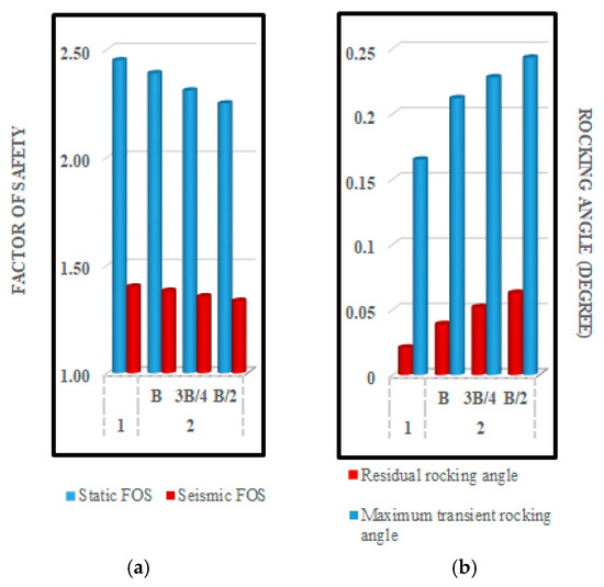 4. Increasing slope deformations led to higher vertical deformations in the soil under the building nearest to the slope, and as a result, the foundation rocking angle intensified. The correspondence between the FOS of the slope and the foundation rocking angle is shown in Figure 14. A similar tendency to the slope deformations occurs when the number of buildings increases and the distance between the buildings decreases; the maximum transient and residual foundation rocking angles at the foundation of the building nearest to the slope are presented in Figure 15. Increased rocking worsens the superstructure seismic performance. In the scope of this study, it has been proved once again that rocking increases in the superstructure under the slope effect. It is also understood that the rocking element characteristic has a significant effect on the superstructure seismic performance. Figure 15 shows that at the distance where the adjacent building is nearest to the slope (i.e., 2-B/2), generally, higher foundation rocking angles were calculated during the earthquake duration. The lowest foundation rocking angles were calculated when the building nearest to the slope was alone (i.e., 1). The maximum foundation rocking angle calculated at 2-B/2 (i.e., 0.24°%) is 41.18% higher than that calculated at 1 (i.e., 0.17°%).