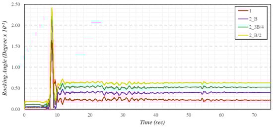The foundations of buildings shake during strong ground movements. The rocking foundation affects structural rotation and damping. Structural rocking, on the one hand, limits the force demand and, on the other hand, transfers the ductility demand from the superstructure to the soil [45]. Foundation rocking is measured in terms of the rocking angle. To determine the rocking angle in the direction of strong ground motion during the time history analysis, in every time step, the angle between the foundation slab and the horizontal plane was calculated. Figure 15 presents the rocking time history of the building foundation nearest to the slope subjected to the 2023 Kahramanmaraş-Pazarcık earthquake. The foundation rocking angle of the building nearest to the slope was affected by the variation of both the number of buildings and the distance between buildings. During the earthquake duration, the highest foundation rocking angles were recorded for the 2-B/2 case, and the lowest were recorded for the 1 case. The maximum transient and residual foundation rocking angles captured in the changed conditions are also recorded and presented in Figure 14b. In this study, the effect of the presence of a slope on the rocking element was clearly seen. The decreasing FOS of the slope in Figure 14a and the increasing foundation rocking angle in Figure 14b are in good agreement. As the number of buildings multiplies and the distance between the buildings shortens, the raise in the loads transmitted to the slope decreased the FOS of the slope, and the increasing slope deformations enhanced the vertical displacements in the soil under the foundation and the rocking element effect. The maximum foundation rocking angle calculated at 2-B/2 (i.e., 0.24°%) is 41.18% higher than that calculated at 1 (i.e., 0.17°%).