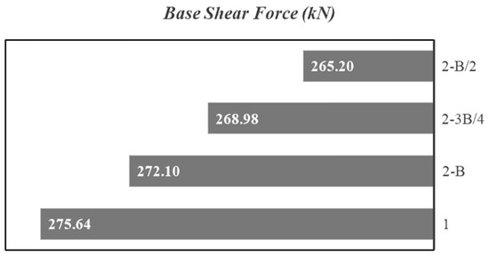 5. Since the maximum shear demands captured at the storeys of the building nearest to the slope in changed cases are below the maximum permissible shear capacity in accordance with IBC 2006 [10], no shear failure occurs at the building storeys for all cases (Figure 16a). Contrary to previous studies [5,7,8,35] where it was inferred that increasing slope deformations and decreasing the FOS of the slope increase the base shear demand of the superstructure near the slope, in this study it is clearly understood that the base shear demands are largely shaped by the SSSI effect. Figure 17 represents the base shear demand for the building nearest to the slope, which decreases with the presence and proximity to slope of the adjacent building. The base shear demand of the building nearest to the slope is 275.64 kN if the building is alone (i.e., 1), while the base shear demand decreases to 265.20 kN (i.e., 3.80% reduction) in the presence of the adjacent building and in the location nearest to the existing building (i.e., 2-B/2). The reduction in the base shear demand of the building nearest to the slope in the presence and proximity to slope of the adjacent building is in agreement with previous studies [38,39].
