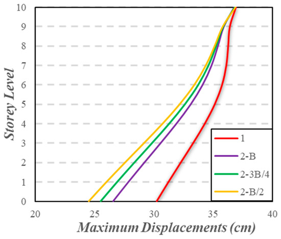 6. The maximum storey displacements were shaped according to the storey shear demand. The ratio of the storey shear demand of the building nearest to the slope to the base shear demand increased with the SSSI effect, especially at the lower storeys (Figure 16b). As a result of this situation, the maximum storey displacements were near in the upper storeys of the building in which the base shear demand did not change much in the changed conditions, while the maximum storey displacements decreased in the lower storeys with the SSSI effect. As shown in Figure 18, while the maximum lateral displacement of 31.2 cm is obtained at the 1st storey of the building alone, this value decreased significantly with the SSSI effect and reduced to 26.0 cm at 2-B/2 (i.e., 16.7% reduction). The significant change in the displacements of the lower floors of the existing building with the proximity of the adjacent building is consistent with the previous study [46] on SSSI.