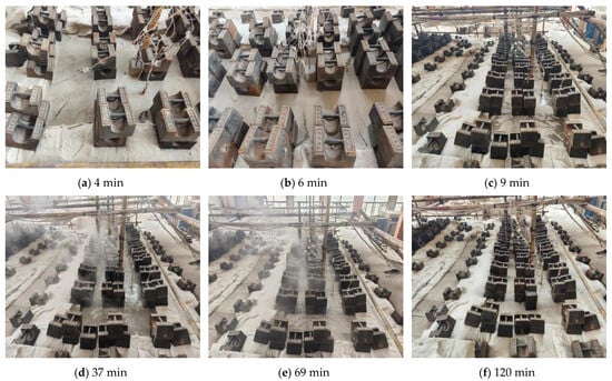 26] standard temperature–time curve. The lower flange, web, lower surface of the upper flange of the castellated steel beam, and the lower surface of the concrete slab were exposed to fire. Prior to the tests, the columns and concrete foundation beams were fire-protected with rock wool.