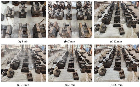 Figure 6b). At 12 min, the arc-shaped cracks at the beam end further developed with gradually increasing water stains. Transverse cracks appeared at intervals of approximately 200 mm along the length of the plate (