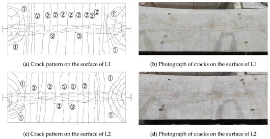 Figure 5b). At 9 min, the arc-shaped cracks at the beam end further developed with gradually increasing water stains. Transverse cracks appeared at intervals of approximately 200 mm along the length of the plate (