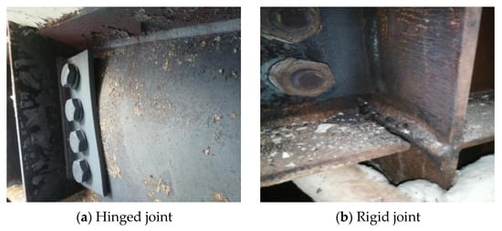 27]. In all cases, the bottom flange experienced torsional deformation, and both the end web and bottom flange underwent buckling failure. For the hinged restraint castellated composite beam, the joint suffered severe damage, with significant deformation of the end plate connecting the steel column and beam and relative slip between the bolts and nuts (