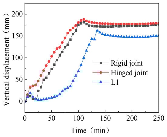 Figure 13 shows the mid-span displacement–time curves of castellated composite beams with different joint types. It can be observed that the mid-span displacement of the semi-rigid restraint castellated composite beam is significantly smaller than that of the rigid and hinged restraint beams under the same heating duration. In conclusion, the semi-rigid restraints castellated composite beam exhibits superior fire resistance compared to the hinged and rigid restraint beams.