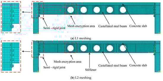 24], except for the constraint conditions. The failure modes of L1 are similar to those of the hinged and rigid restraint castellated composite beams in reference [