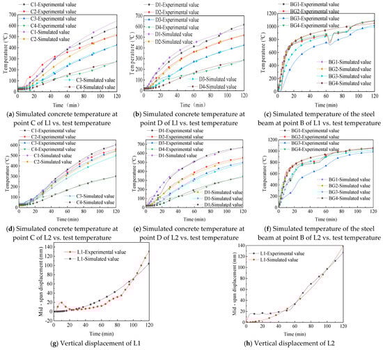 Data collection continued until 250 min. At that time, the maximum mid-span displacements of L1 and L2 were 162.9 and 149.3 mm, respectively, and the residual deformations after cooling were 150.7 and 133.7 mm, respectively. The deformation recovery ratios were 7.5% and 10.4%.