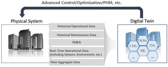 Relationship between physical system and digital twin (FMEA: failure mode and effect analysis; CMs: continuous models; DEMs: discrete event models; SMs: statistical models; ML: machine learning; PHM: prognostics and health management) [].
