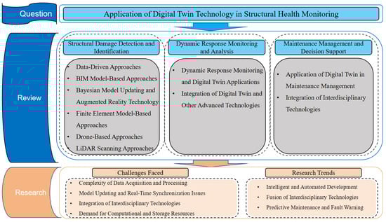 This research focuses on the application of DT technology in SHM, aiming to provide a comprehensive review of its capabilities and potential to address the limitations of traditional SHM methods (Figure 2). Specifically, it investigates how DT enhances real-time monitoring, predictive maintenance, and decision-making processes in SHM. By leveraging DT technology, this study aims to overcome key challenges in structural damage detection, dynamic response analysis, and maintenance management, thereby providing directions for future research in the DT technology for SHM.