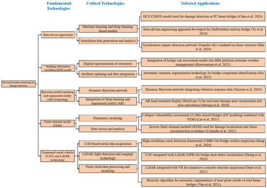 A summary of DT applications in structural damage detection and identification is presented in Figure 3. Within DT technology, SDD evolves through six interconnected approaches (Table 1), unified under DT to integrate physical data, simulation models, and real-time monitoring into a dynamic detection system. With a comprehensive SHM review, we identify three key synergies: (1) data-driven methods mitigate the computational constraints of finite element methods (FEMs); (2) unmanned aerial vehicle (UAV) and building information modeling (BIM) fusion enables multiscale visualization; (3) hybrid Bayesian frameworks bridge simulation–reality gaps. This taxonomy highlights the methods’ complementarity and their integration within DT frameworks to address complex damage detection problems.