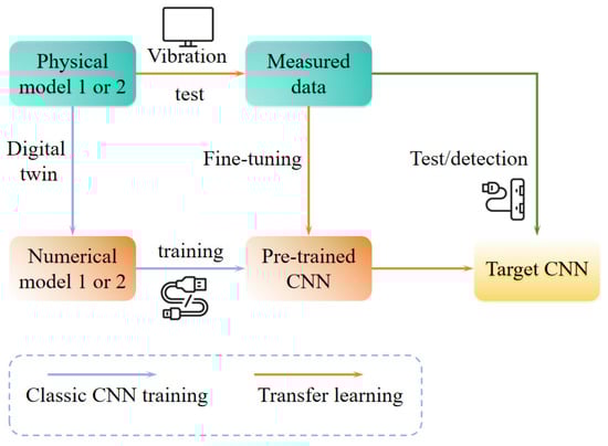 The data-driven methods focus on extracting meaningful information from sensor data to assess structural health. While digital models can generate sufficient data for various health states, domain shift issues between simulated (source domain) and real-world (target domain) data persist [,]. To mitigate this, transfer learning (TL) techniques adapt deep learning models to the target domain. A novel structural damage detection method combines digital models with TL, using neural networks to learn from simulated monitoring data []. Furthermore, physics-informed transfer learning effectively addressed domain discrepancies by constructing empirical physical models from data, enhancing model interpretability []. However, TL faces challenges in real-time domain adaptation, especially with large-scale sensor data.