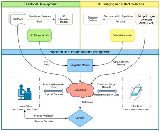 With rapid advancements in unmanned aerial vehicle (UAV) technology, UAV-based SHM has emerged as a transformative approach []. UAVs capture high-resolution images processed into 3D digital point clouds via photogrammetric techniques, enabling virtual twin creation and textured 3D scene generation []. Integrated with the DT framework, UAVs enhance real-time visual monitoring through scalable structural data []. As a result, UAVs have become a valuable tool in infrastructure monitoring, offering an efficient, non-invasive solution for assessing structural integrity. For instance, a post-earthquake evaluation framework combines UAV imagery, component recognition, and damage assessment []. In addition, a UAV–bridge information modeling (BrIM) system automates concrete bridge deterioration detection using computer vision, as shown in Figure 5, comprising three phases: 3D model development, UAS data processing for defect detection, and cloud-based model integration for inspections []. However, processing UAV-collected high-resolution imagery requires significant computational resources, causing model update delays [].
