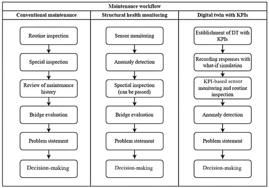 Structural deterioration has become an increasingly significant global challenge, with diverse maintenance and management issues emerging []. Traditional methods, which rely heavily on documentation and visual inspections, fail to detect latent damage until it progresses into major problems []. Moreover, these methods often face computational complexity and inefficiency when addressing material nonlinearity. To address these challenges, researchers have developed innovative approaches that enhance both accuracy and efficiency by simplifying material nonlinearity in double nonlinear analysis for calculating the ultimate bearing capacity of in-service reinforced-concrete (RC) arch bridges. These methods achieve significant computational efficiency improvements while maintaining accuracy comparable to that of traditional approaches []. Figure 6 compares the workflows of traditional maintenance, SHM, and key performance indicator (KPI)-based DT maintenance. Documentation-based inspections are additionally prone to data loss, time-consuming analyses, and operational interruptions, resulting in reactive maintenance, which often accelerates deterioration and service disruptions.