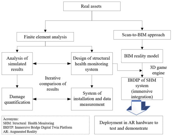 In addition, a DT framework combining ground-penetrating radar (GPR) scanning for bridge deterioration detection with augmented reality (AR) visualization has been developed. This integration illustrates the trend of combining DT with advanced sensing and visualization tools for effective diagnostics and maintenance. The AR system, deployable on tablets or mixed-reality headsets, integrates visual and location-tracking capabilities with GPR evaluation, validated through field experiments to provide timely preventive maintenance insights []. Moreover, an immersive bridge DT platform has been introduced to enhance the efficiency and accuracy of bridge health monitoring and maintenance. The research framework is shown in Figure 7. Integrating BIM, IoT sensor data, virtual reality (VR), AR technologies, and real-time structural feedback loops, the platform addresses issues such as insufficient data visualization and interactivity in traditional systems. By creating a high-fidelity digital replica of a bridge and synchronizing its real-time physical state, engineers can monitor the bridge’s health, diagnose faults, and perform predictive maintenance in a virtual environment [].