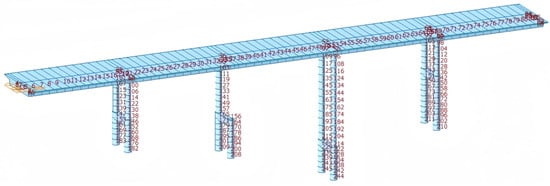 According to the design standards “General Specification for Highway Bridges and Culverts” (JTG D60-2004) and “Design Code for Highway Reinforced Concrete and Prestressed Concrete Bridges” (JTG D62-2004) [,], a finite element analysis was conducted on the bridge based on its reinforced concrete structure; the model consists of 210 beam elements and 193 nodes and the bridge calculation model is shown in Figure 2. The bridge’s load-bearing capacity, crack width, and deflection all meet the requirements of the specifications; however, the safety reserve factor for the load-bearing capacity of Pier 2-2 is relatively low.
