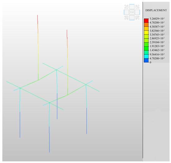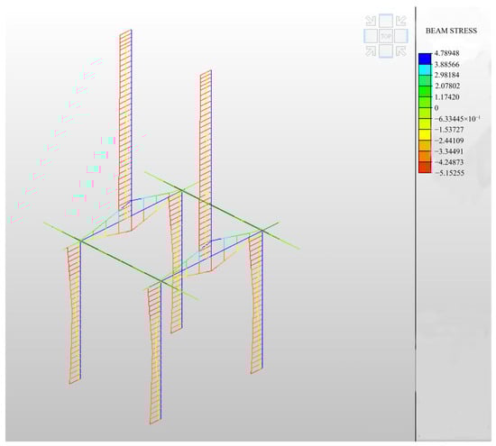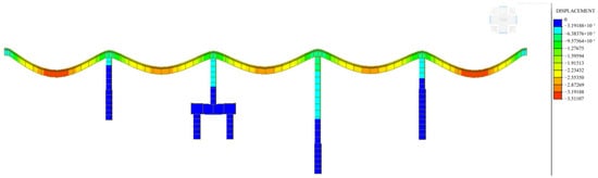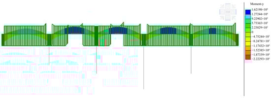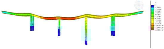 Based on the design calculation parameters, we used finite element software to analyze the load-bearing capacity of the bridge after underpinning. The simulation results serve as a reference for the design phase, and during the implementation process, real-time monitoring data is used to guide construction. The finite element calculation model is shown in Figure 9, and the calculation results are shown in Figure 10 and Figure 11.