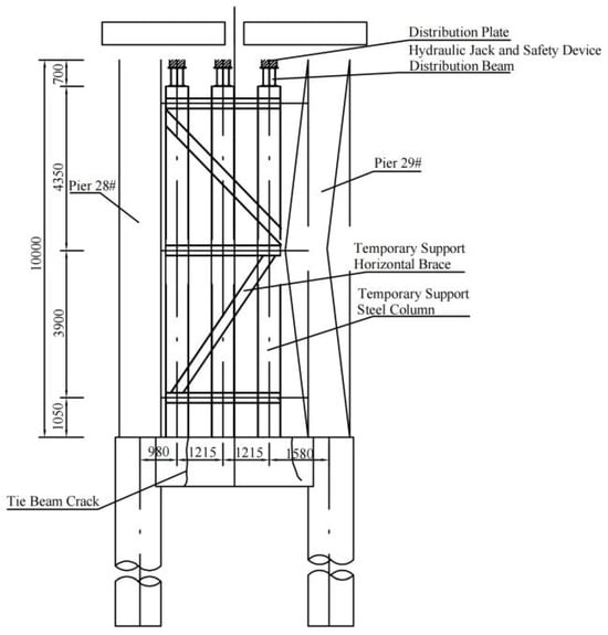 After the grouting treatment of the concrete cracks in the binder of Pier 2, it was used as the emergency temporary support foundation. Steel pipe columns of 600 × 14 mm were used, with sway bracing and diagonal braces made of 28-channel steel. At the top of the steel pipe columns, I-beam 50 steel pad beams were arranged, and jacks were placed on the pad beams. The temporary support is shown in Figure 6. The lifting capacity of the jack at the top of the steel pipe column for the third temporary support is 20 tons, and the remaining jacks only need to be tightened.
