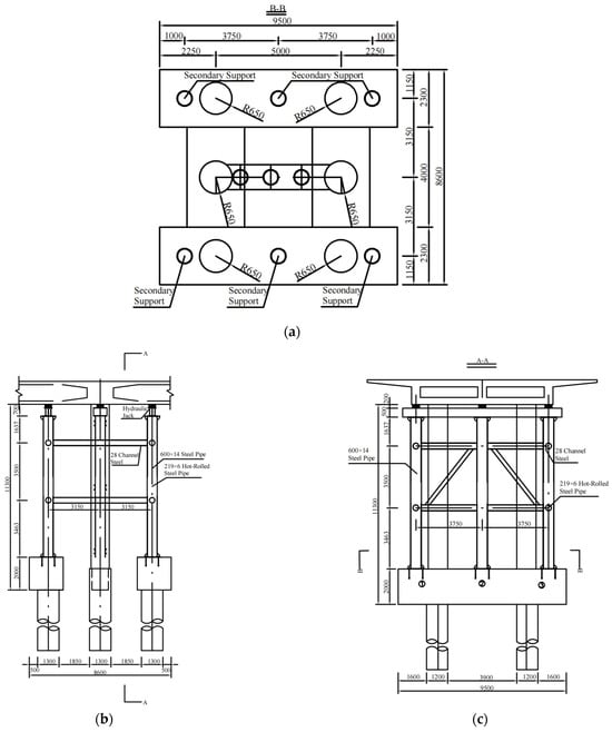Schematic diagram of the underpinning support system. (a) Layout plan of the new pile foundation and bearing platform. (b) Elevation view of the steel pipe support system. (c) Section view of the steel pipe support system.