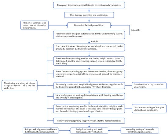 To address the challenge of repairing the damage to concrete box girder bridge piers on mountainous highways caused by falling rocks, this paper proposes an active underpinning technique that integrates a “井”-shaped cap system, graded preloading of the foundation, and synchronized beam body correction. The technique utilizes lateral beam preloading (to eliminate the inelastic deformation of the new pile foundation) and longitudinal beam connections (to form overall stiffness). The method involves building temporary and permanent support systems in stages. Through the two-stage temporary support system transition, the removal and in situ reconstruction of the old piers, a smooth transition from the pier–beam consolidation system to the basin-type bearing system is achieved while simultaneously performing precise correction of beam torsion. The structural safety during the construction process was verified through finite element simulations and dynamic monitoring. Monitoring results show that the beam torsion recovery effect is significant (maximum lift of 5.2 mm/settlement of 7.9 mm), and the pier strain (−54.5~−51.3 με) remains within a controllable range. Before the bridge was opened to traffic, vehicle load and impact load tests were conducted. The actual measured strength and vertical stiffness of the main beam structure meet the design requirements, with relative residual deformation less than 20%, indicating that the structure is in good, elastic working condition. The vehicle running and braking dynamic coefficients (μ = 0.058~0.171 and 0.103~0.163) are both lower than the theoretical value of 0.305. The study shows that this technique enables the rapid and safe repair of bridge piers and provides important references for similar engineering projects.