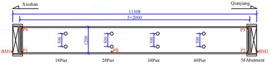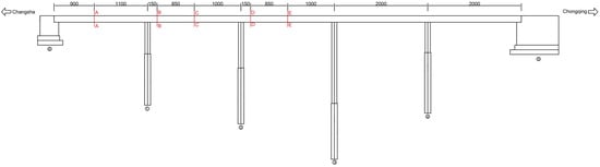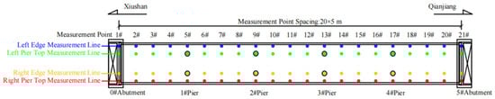 Bridge deflection is measured using a TS60I0.5″R1000 total station. A total of 11 measurement points are set up on the beam, as shown in Figure 14.