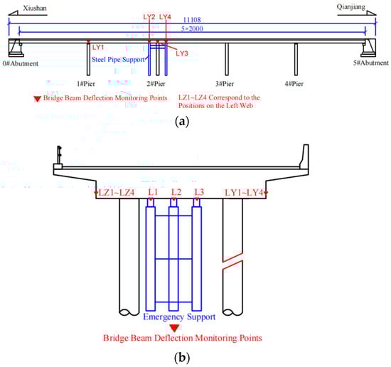 Schematic diagram of bridge beam deflection measurement points. (a) Elevation view and (b) cross-section diagram.