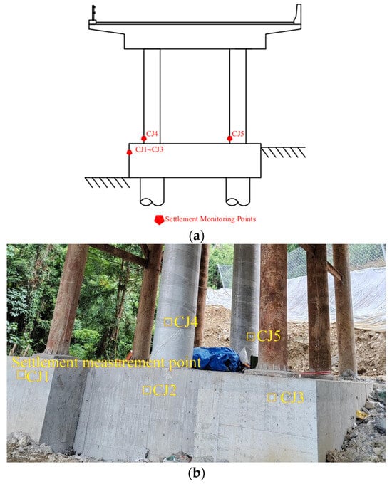After repair, the bridge’s technical condition grade is restored to Class 2, and regular monitoring shows that the structure remains stable. To address long-term risks, it is recommended to extend the monitoring period in stages (monitoring differential settlement and fatigue damage every 7 days/month/quarter within 3 years). Additionally, non-destructive durability assessments should be included in annual inspections (such as ultrasonic crack extension detection and electrochemical potential method to assess rebar corrosion rate) to control creep and material degradation. Referring to Ding et al. (2024) [] on the long-term settlement of shield tunnel pile underpinning, future studies could integrate BIM models to predict the evolution of creep.