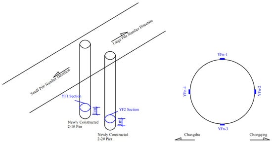 Underpinning technology, as a rapid repair technique that minimally affects the normal functioning of structures, is widely used in old bridge renovation [], tunnel engineering [,] and building construction. To ensure the safety of the superstructure, pile foundation underpinning technology is often used to transfer the overlying load from existing pile foundations, enabling the smooth progress of new construction projects []. However, underpinning technology carries high risks during application, and comprehensive monitoring is required to ensure safe and reliable construction []. Numerous scholars have conducted studies on the construction techniques and monitoring of bridge underpinning processes. Peng [] addressed the challenges of deformation control in deep foundation pit projects passing under elevated metro bridges. Based on existing projects, he used numerical simulations and on-site measurements to study the impact of pile foundation underpinning and deep foundation pit construction on elevated metro bridges and rail structures and designed the key parameters. Zhang [] studied a typical case of metro shield tunnel construction passing through urban interchange bridge piers, using numerical simulations and on-site measurements to analyze the underpinning process. Li [] conducted a case study on the pile foundation group of the Guangzhou–Shenzhen Expressway bridge crossed by Shenzhen Metro Line 10. He analyzed the stress transfer mechanisms of the pile foundation during the underpinning process and investigated the impact of the shield tunnel on the stability of the pile foundation. Yan [] created three local node models of underpinning structures with a similarity ratio of 1/1 to study the theory and application of pile foundation underpinning technology, and conducted progressive repeated static loading tests. They studied the shear and antislip properties of the joints and proposed an improved formula for calculating shear capacity. Zheng [] analyzed and studied the impact of the active underpinning process of shield tunnel pile foundations on the deformation of the lower bridge structure through numerical simulation and on-site monitoring. Qiao [] employed an active underpinning technique using a spatially continuous lattice underpinning structure. By integrating the monitoring and measurement data, reasonable control indicators were developed to maintain operational safety, successfully addressing the underpinning of highway bridge piers under dynamic loading conditions. Liu et al. [] studied the feasibility of pile foundation underpinning solutions in specific environments and the efficiency of underground space utilization, achieving effective control of engineering risks. Li [] used software to perform finite element analysis on both the superstructure and substructure of a bridge to simulate and calculate stress conditions. Passive underpinning technology was employed for construction, with settlement deformation monitoring and comparison conducted throughout the process. Key technical control points for construction were proposed.