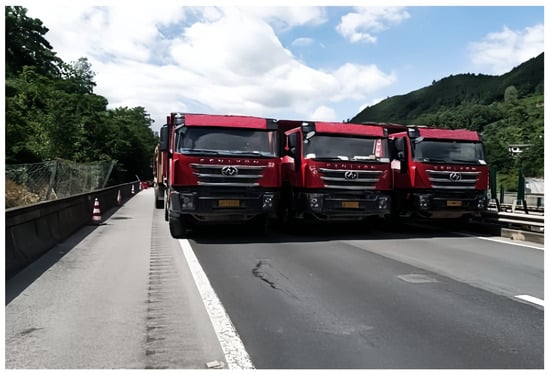 To study and evaluate the safety and performance of the structure, a load test is conducted on the bridge before reopening to traffic. Factors such as impact load, construction disturbances, and changes in the original support system are considered. By measuring the deformation and internal forces of the bridge structure under static load test conditions, the actual performance of the reinforced bridge structure is verified. This allows for the evaluation and study of the actual working state of the bridge after reinforcement and its compliance with the design expectations. Additionally, dynamic load tests are conducted to understand the inherent dynamic characteristics of the bridge after reinforcement, clarifying its dynamic performance under operational loads. The load test is shown in Figure 19.