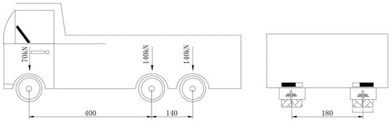 The test control load uses the standard value of vehicle load (considering the impact factor) and follows the highway class I load specified in the “General Specifications for Highway Bridge and Culvert Design” (JTG D60-2004) []. The vehicle load considers both central and eccentric loading as the most unfavorable conditions. The loading parameters are shown in Figure 21. Under the action of moving vehicle loads, the internal force diagrams and deformation envelope diagrams of the bridge structure are shown in Figure 22 and Figure 23. The calculated bending moment, test bending moment, and corresponding load efficiency coefficients for static loading conditions of the test span are shown in Table 10.