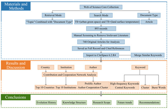 Based on the literature on UGSs and LST in the WOS database, the CiteSpace scientometric analysis tool was used to analyze the relevant literature metrologically, form a corresponding knowledge map, and identify the knowledge structure and core research content of the research field. WOS was used to export citation reports to analyze the annual trends in the annual number of publications and citations, and the literature was imported into CiteSpace (6.2. R4). Collaborative network analyses of countries, institutions, and authors were performed with a time slice of one year to identify the collaboration between countries, institutions, and authors. Finally, keyword co-occurrence and clustering and emergent word analyses were performed to identify hotspots and trends (Figure 1). To prevent certain keywords from influencing the outcomes, similar keywords were combined, such as “land surface temperature” and “land surface temperature (LST)”; “heat island”, “urban heat island” and “urban heat island (UHI)”; and “green space”, “green area”, “urban green space”, and “urban greenspace”.