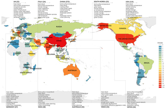 CiteSpace was used to analyze national contributions and collaboration networks, which aids in understanding the global patterns of academic collaboration and knowledge dissemination pathways. The countries with the most articles were China, the United States, India, Germany, Iran, and Australia (Table 1). Among them, the United States was the first to focus on this field, beginning to publish articles in 2004. China had the most articles, with 373 total (accounting for 50.40% of the total), with the earliest article published in 2011. Although research on the effect of UGSs on LST in China began late, the number of publications has been growing rapidly each year, exceeding 60 papers annually from 2022 to 2024. The spatiotemporal distribution of national publications and a visualization of keywords for the top ten countries in terms of publication volume are shown in Figure 3.