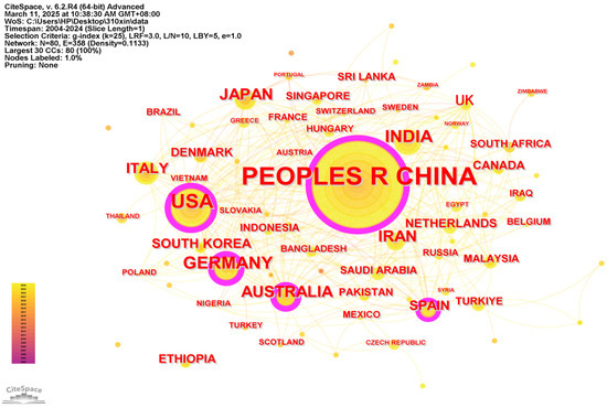 Generated country-cooperation network mapping (Figure 4) exhibited 80 nodes and 358 edges. The density of the cooperation network between countries was 0.1133, indicating cross-country cooperation and exchange between countries worldwide. The mapping nodes surrounded by purple circles represent high-influence countries with high mediator centralities. Germany had the highest centrality (0.40), demonstrated a strong academic influence, and worked closely with Poland, Australia, Finland, Denmark, and Slovakia. China’s centrality was also high (0.36) and mostly cooperated with countries such as Poland, Australia, Bangladesh, Slovakia, Malaysia, and Denmark. The United States and Australia had centralities of 0.22 and 0.21 (Table 2). The USA mostly collaborated with Australia, Poland, Bangladesh, Indonesia, and Malaysia. Cooperative relationships existed among Australia, Vietnam, Indonesia, and Malaysia. Several small international collaborations existed between Spain, Malaysia, Mexico, Argentina, India, Malaysia, South Africa, and Italy.