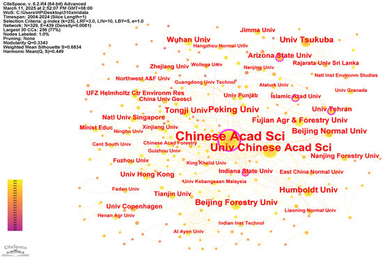 Generated institutional collaboration network mapping is shown in Figure 5, with 329 nodes and 439 edges. In terms of institutional publication volume, the Chinese Academy of Sciences had the highest publication volume of 92 articles, beginning in 2011. Other research institutions with more publications were the University of the Chinese Academy of Sciences, Peking University, University of Tsukuba, Beijing Forestry University, and Humboldt University, which published 45, 18, 15, 15, and 14 articles, respectively. These institutions contributed significantly to the accumulation of knowledge and academic development in this research area.