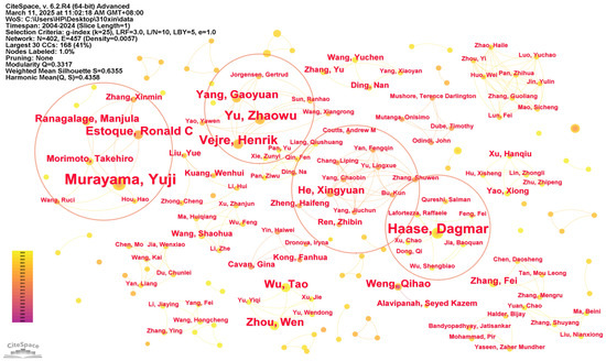 Researchers are the driving force behind the advancement of subject areas, and analyzing authors in a research area reveals the social relationships among scholars. The generated knowledge network map had 402 nodes and 457 connecting lines (Figure 6). The size of the nodes intuitively reflects the degree of the authors’ contributions, with highly productive authors such as Murayama Yuji, Haase Dagmar, Vejre Henrik, and Yu Zhaowu publishing 13, 10, 8, and 8 papers, respectively, and making significant contributions to research on the impact of UGSs on LST.