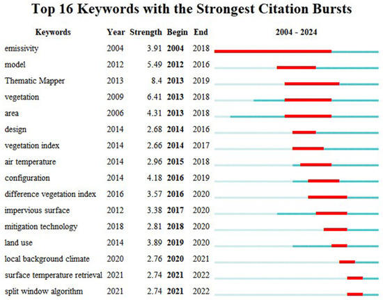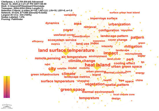 The k-value was set to 15 in CiteSpace, and the merged network was clipped using ‘pathfinder’ and ‘pruning the merged network’ settings. The CiteSpace keyword clustering results generated a keyword co-occurrence network containing 334 nodes and 1399 edges (Figure 7) and a network density of 0.0252. The size of the nodes indicates the co-occurrence frequency, and the connected lines between the nodes indicate the co-occurrence connections between the different nodes. The most frequent keyword was “heat island”, which appeared 481 times and had the highest centrality of 0.09. The terms “cover change”, “normalized difference”, “avhrr data”, “city”, “climate change”, “air quality”, “land surface temperature”, and “circulation” were closely related. This revealed that “heat island” was a research hotspot, LST was a direct indicator of the heat island effect, and the increase in the LST was a direct manifestation of the heat island effect; therefore, the two terms were deemed to be closely related. The emergence of the heat island effect was closely related to climate change, cover change, etc. The term “environment” was also the most centrally occurring keyword, with a centrality of 0.09 and 37 occurrences. “Accuracy evaluation”, “expansion”, “heat reduction”, “convective boundary”, and “climate change” were all strongly associated with “environment”. This demonstrated that “environment” was the core of the research in this field, revealing that people paid increasing attention to the human environment, particularly in the context of global warming and rapid urban expansion.