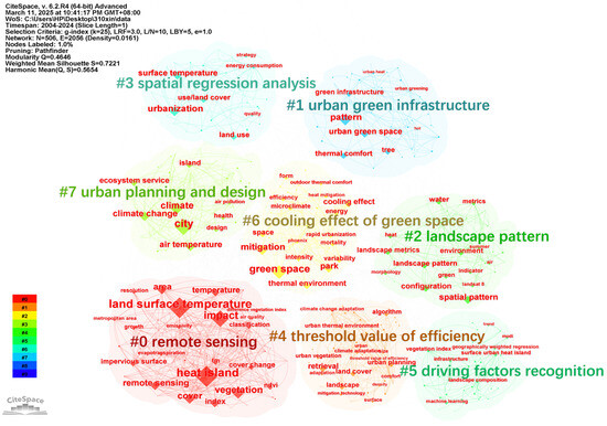 To further explore the research knowledge network structure, data sources, main research methods, and contents in the field of the effect of UGSs on LST, keywords were clustered using the log-likelihood ratio (LLR) clustering algorithm in CiteSpace [48]. Eight main clusters, including “remote sensing”, “urban green infrastructure”, and “landscape pattern”, were obtained, reflecting multiple research directions and categories (Figure 8). Modularity (Q) and weighted average profile (S) scores were used to gauge cluster plausibility. When the Q and S values were >0.3 and >0.5, respectively, clustering was dependable. With a Q value of 0.4646 and a S value of 0.7221, the resulting clustering map shows that the clusters were plausible. The research content for each clustering topic was as follows: