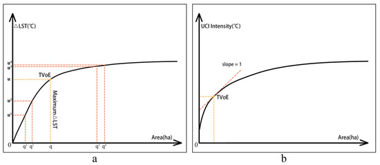 The CE of GS is not a constant value. To optimize the scale of GS construction, improve the cooling capacity of GSs, and guide urban planning, Yu et al. introduced the concept of the ‘law of diminishing marginal utility’ in economics and proposed the concepts of CE and the threshold value of efficiency (TVoE) [40,55]. The CE of a GS patch is defined as the LST difference between the patch and its neighboring urban area, whereas the cooling efficiency is defined as the curve between the area (variable) and maximum cooling intensity of each GS. The point at which the cooling efficiency stabilizes is the TVoE (Figure 9a). When the GS area exceeds this threshold, the cooling efficiency of the GS will decreases. However, there are differences in how the threshold is determined, owing to ununified definitions of the threshold concept. The cooling intensity of the GS is logarithmically related to the size of the patch area. As the patch area increases, the cooling intensity also increases. However, the rate of increase gradually slows; therefore, some scholars believe that when the slope of the fitted logarithmic curve is 1, the corresponding area value is the TVoE (Figure 9b) [9,85,86]. There are also differences in the results owing to differences in research perspectives.