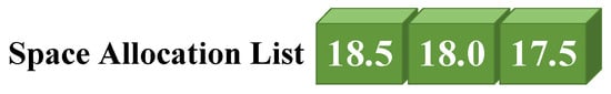 The chromosome representation of the space allocation, which consists of the space allocation list , represents the space allocation plan. The list = () contains real numbers that define the storage space for each material. Based on the lower and upper bounds of , as shown in Equations (5) and (6), the feasible domain of is , ensuring that all chromosomes are feasible under the storage space constraint. Figure 1 illustrates an example of the chromosome representation in the space allocation layer for three materials, assuming that the total storage space for materials at the project site is 54 units.