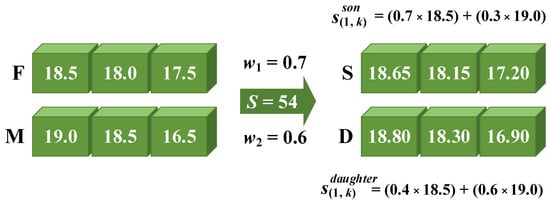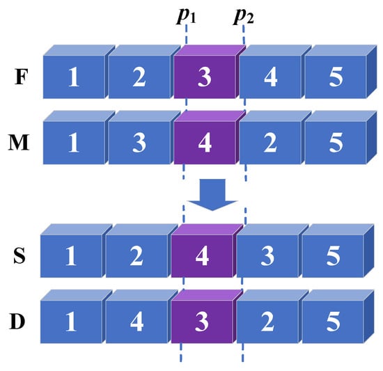 An illustrative example of the crossover operator applied to the space allocation list and the activity list is shown in Figure 3 and Figure 4, respectively. In these figures, F and M represent the selected parents (father and mother), while S and D represent the two produced offspring (son and daughter).