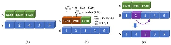 Since the crossover operation is completed, mutation is applied to enhance population diversity. With a probability of and if a randomly generated number satisfies the condition , the genetic algorithm (GA) performs a mutation operation separately on the two lists of an individual, the space allocation list and the activity list, as shown in Figure 5. Let the current generation be represented by . For the space allocation list, we introduce an interval mutation operator. In this operator, a material is randomly selected from all available materials, and is transformed into a random value within the interval where . If the mutated space allocation list is infeasible or results in inefficient use of space, we randomly adjust until the allocation becomes feasible. For the activity list, the mutation operator is applied to each gene. To ensure precedence constraints are met, the feasible positions () for an activity must be placed after all its predecessors and before all its successors. The activity is then randomly inserted into a new feasible position.
