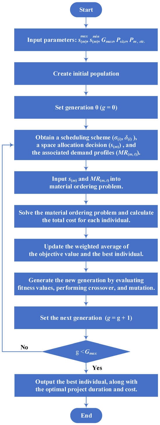Given the NP-hard nature (a classification of computational problems for which no known algorithm can solve all instances efficiently in polynomial time) of the PSMOP-LSS, the flexibility, scalability, and multi-objective capabilities of genetic algorithms make them superior to traditional MIP approaches and other metaheuristics. Their ability to integrate adaptive constraints, handle uncertainty, and optimize large-scale project scheduling problems ensures their effectiveness in addressing complex, real-world construction challenges. Therefore, this study applies a genetic algorithm approach to obtain the optimal solution for the PSMOP-LSS model.
