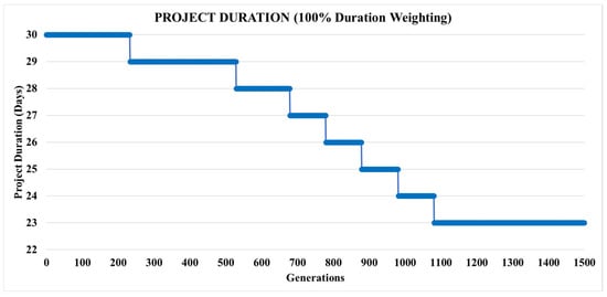 To evaluate genes, an objective function can be calculated by eliciting the user’s preferences (or weights) for the bi-objectives. The user must input the weight , representing their preference for minimizing project duration, and the weight , representing their preference for minimizing project cost. These weights, along with moment types, are constants that reflect the project manager’s objectives. When the initial population () is generated, the initial project duration () and initial project cost () are determined by selecting the gene () with the highest fitness value, calculated using Equation (30). Before generating the initial population (), and are set to 1 to ensure that the initial fitness value is minimized. When generating the next generation (), the new project duration () and new project cost () for each next gene () are evaluated. Each next gene () is then assessed for its fitness value by calculating the weighted average compared to and from the previous generation, as described in Equation (30). The smaller this fitness value (above 1.0), the shorter the project duration and the lower the project cost, and consequently, the more fit the gene is. It should be noted that the fitness function, as described in Equation (30), accounts for the minimization of both project duration and project cost. Furthermore, because the algorithm uses the roulette wheel rule as its selection operator, individuals with lower total costs are more likely to be chosen for the next generation.
