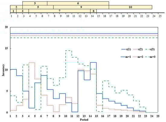 To perform project scheduling based on critical path analysis transparently, we model it using the precedence relationships as in Equations (7)–(13). The delay period of each activity, defined as the time beyond its early start, is introduced as a decision variable. Initially, the delay period for each activity can be set to zero. These delay values allow adjustments to the schedule to ensure that the material requirements of each period are met with the available material at the beginning of that period.