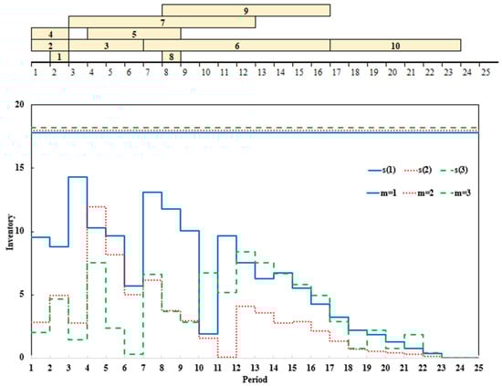 The sufficient factor, as described in Equation (22), determines whether material must be ordered at the beginning of the current period, based on whether the remaining inventory at the end of the previous one-unit period is sufficient to meet the material requirement. If the inventory is insufficient, the sufficient factor takes a value of 1; otherwise, it takes a value of 0. The balance factor ensures that material is not ordered in excess of the total quantity required for the entire project. Specifically, if the accumulated ordered material up to the beginning of the previous one-unit period has not yet reached the total requirement for the entire project, the balance factor takes a value of 1; otherwise, it takes a value of 0, as described in Equation (23). Equation (24) introduces an auxiliary binary variable, which equals 1 if an order is placed in period t for material m and 0 otherwise. This auxiliary binary variable depends on the sufficient factor and the balance factor. When considering the auxiliary binary variable, the variable will be a binary variable generated through randomization. If the inventory quantity of the material is sufficient to meet the material requirement and the accumulated ordered material is less than the total requirement for the entire project, ordering additional material is optional. However, additional material must be ordered if the inventory quantity of the material is insufficient to meet the material requirement. Conversely, no additional material should be ordered if the accumulated ordered material already satisfies the total requirement for the entire project.