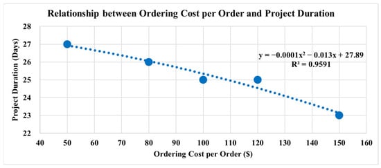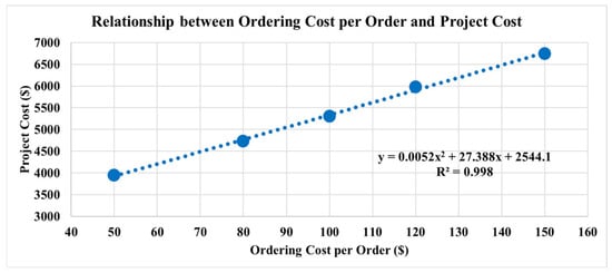 In cases where the ordering cost per order increases, it can lead to higher project costs but shorter project durations. Project managers must decide whether to prioritize cost minimization or faster completion. For example, if ordering costs are high and large quantities of materials are ordered at once, the project may finish sooner. However, the reduction in indirect costs might not offset the increased ordering and inventory costs, potentially resulting in higher overall costs.