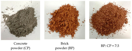 The raw material of the RP was the waste brick and waste concrete generated by the demolition of a building in Shanghai. These raw materials were subsequently smashed, screened by a standard sieve, dried and milled to obtain RP. To determine the milling time, the fineness of the RP was tested at different milling times (30 min, 60 min, 90 min), and the objective was to make the fineness of the RP close to that of the cement. The milling parameters and fineness of different RPs are shown in Table 4. RP(BP:CP = 7:3) [14] was produced in a factory, while the other RP was produced in the lab. The different RPs are shown in Figure 1.