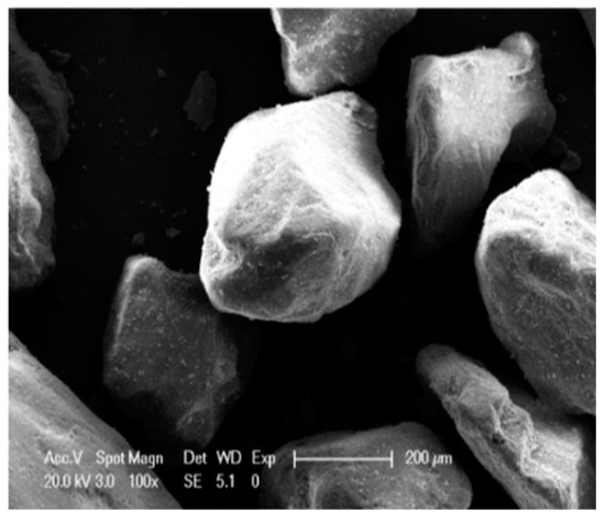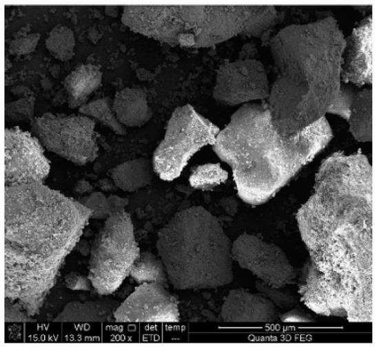 RS was produced from waste concrete. By crushing and grinding, recycled coarse aggregate and recycled concrete stone powder can be obtained. Then, the RS with a particle size less than 2.36 mm was screened by a standard sieve; the particle size distribution is shown in Table 5. The physical characteristics are shown in Table 6. SEM images of the NS and RS are shown in Figure 2 and Figure 3. The surface of the NS is smoother and more rounded than the RS. The surface of the RS is rough, irregular, multi-angular and covered with fine particles, including old fine aggregate, broken stone and old cement matrix. Thus, the RS has greater water absorption than the NS.
