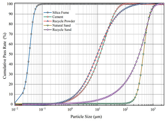 The laser particle size analyzer was used to test the particle size distribution of the raw materials, and the results are shown in Figure 4. It can be concluded that the particle size of the SF was the smallest in the system, and the particle diameter was concentrated in the range of 0.1–1 μm. The particle size distribution characteristics of the cement and RP were similar; the particle diameter was concentrated in the range of 0.3–50 μm and the median particle size (D50) was about 11–18 μm, so their filling effect was similar. The particle size of the NS and RS was mainly distributed around 0.1–1 mm and 0.01–2 mm. The filling effect of the fine aggregate can be enhanced.